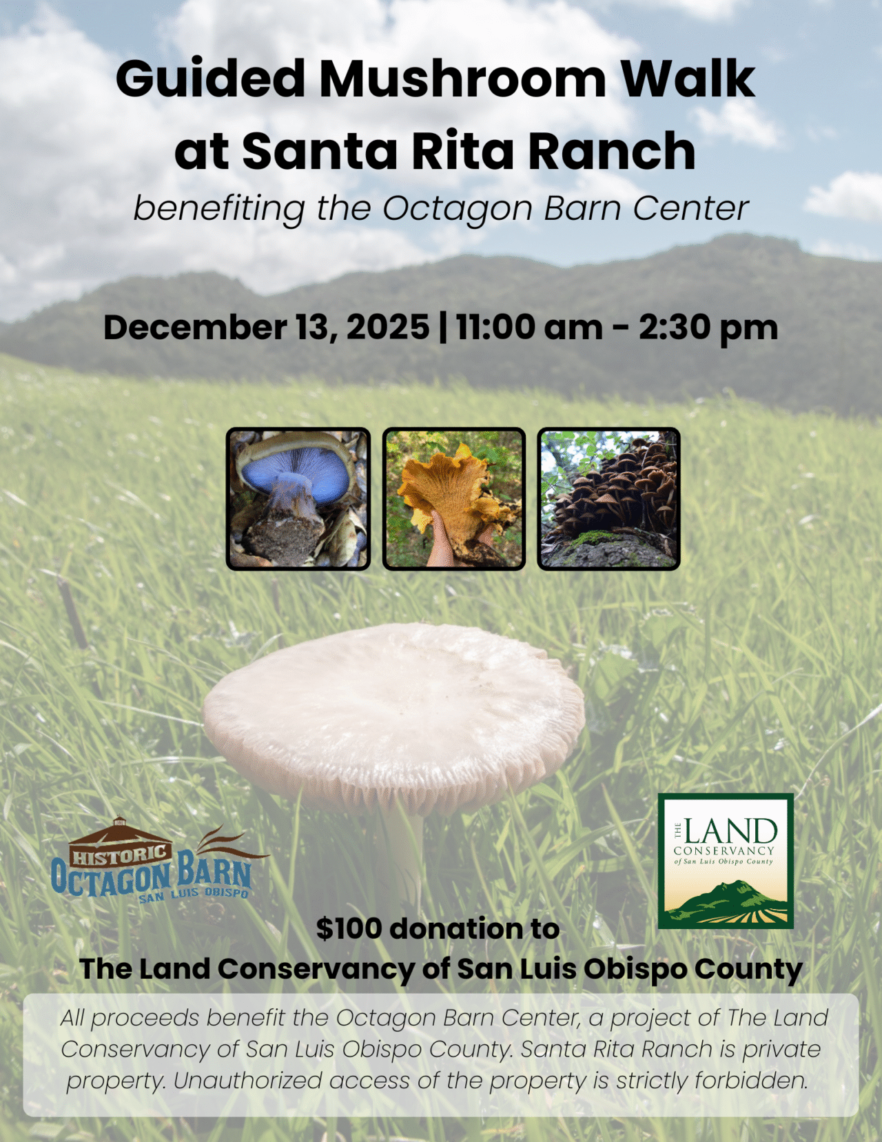 All proceeds benefit the Octagon Barn Center, a project of The Land Conservancy of San Luis Obispo County.Β Santa Rita Ranch, owned and operated by The Land Conservancy of San Luis Obispo County, is a uniquely conserved land. Explore the mixed hardwood and learn about all the mushroom species to be found. After exploring the Ranch, Lindsay Best, LCSLO staff and fungi enthusiast, will help participants identify the gathered mushrooms and will cook up a few for the group to enjoy.